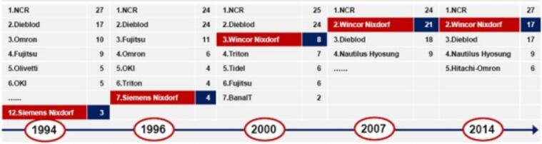 長(zhǎng)期以來,NCR、Diebold、Wincor Nixdorf三家公司(簡(jiǎn)稱“國(guó)際三巨頭”)占據(jù)了全球ATM大部分市場(chǎng)份額,NCR在全球ATM領(lǐng)域市場(chǎng)份額更是連續(xù)多年占據(jù)首位。2015年11月,Diebold與Wincor Nixdorf達(dá)成收購(gòu)協(xié)議,合并成立新公司DieboldNixdorf,新公司取代NCR成為全球最大的ATM制造商。